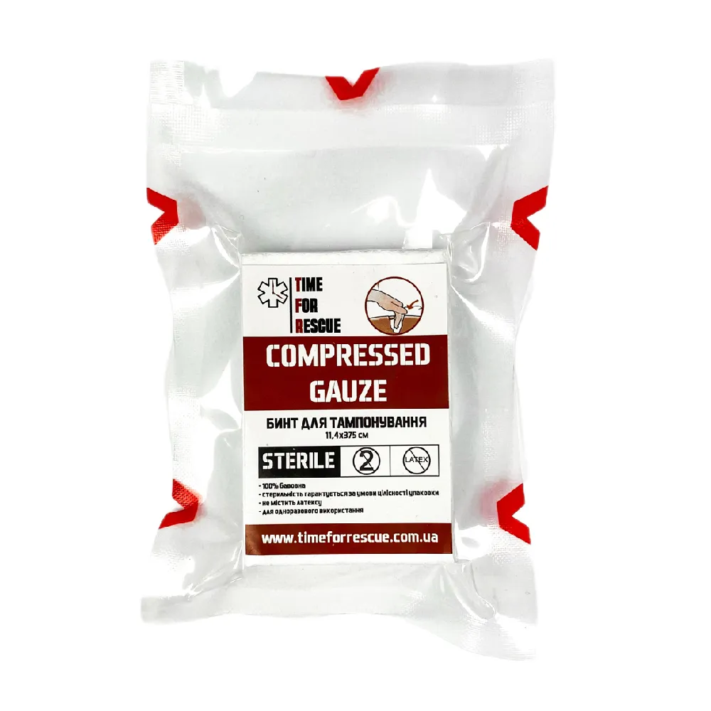 Призначений для швидкої тампонади та перев’язки ран під час надання медичної допомоги в польових умовах та екстрених ситуаціях. Компактний та стислий бинт-марля виготовлений зі 100% бавовни, що швидко вбирає рідину.