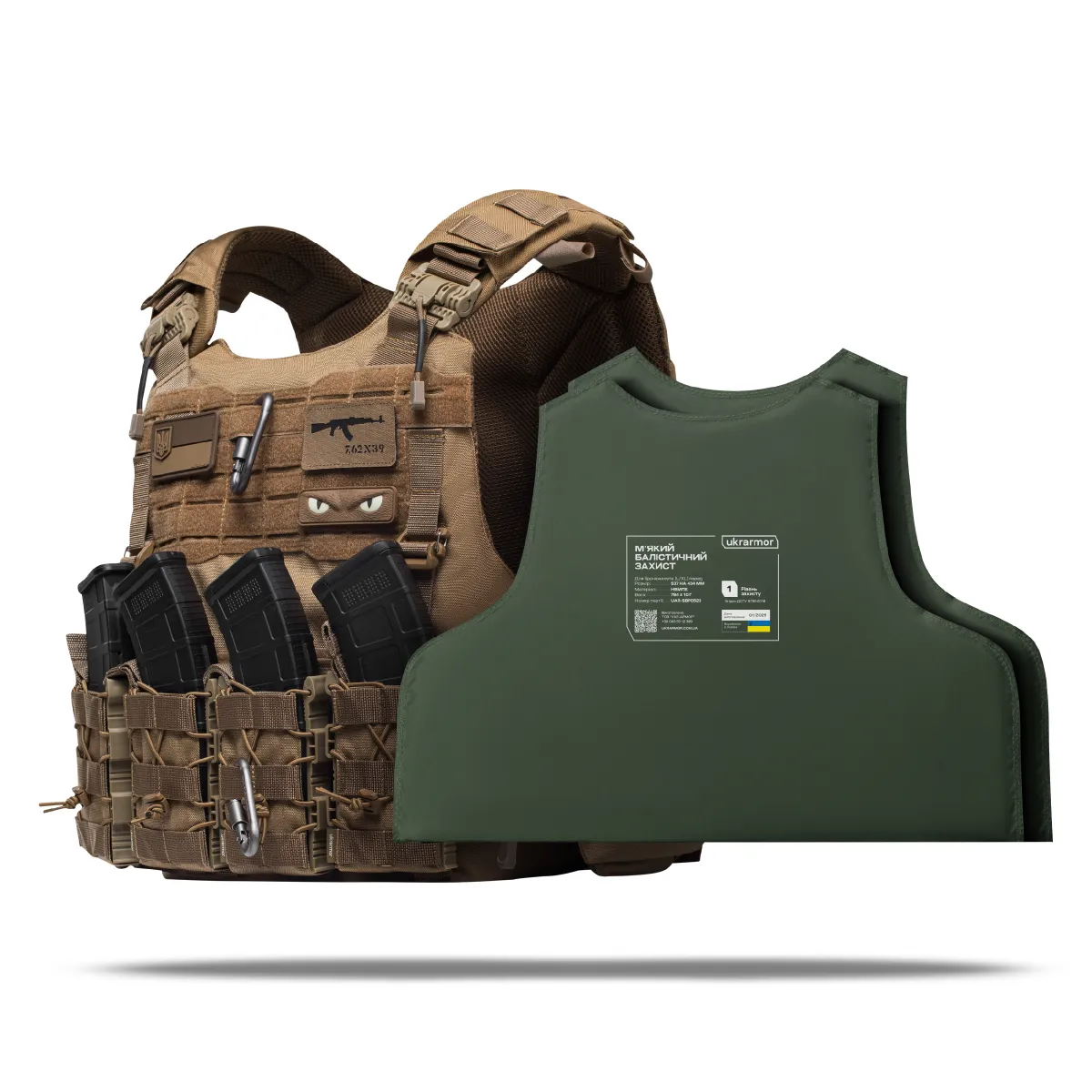 - Комплектація Збільшена плитоноска та два балістичних пакети 620 на 470 мм., що покривають всю площу плитоноски