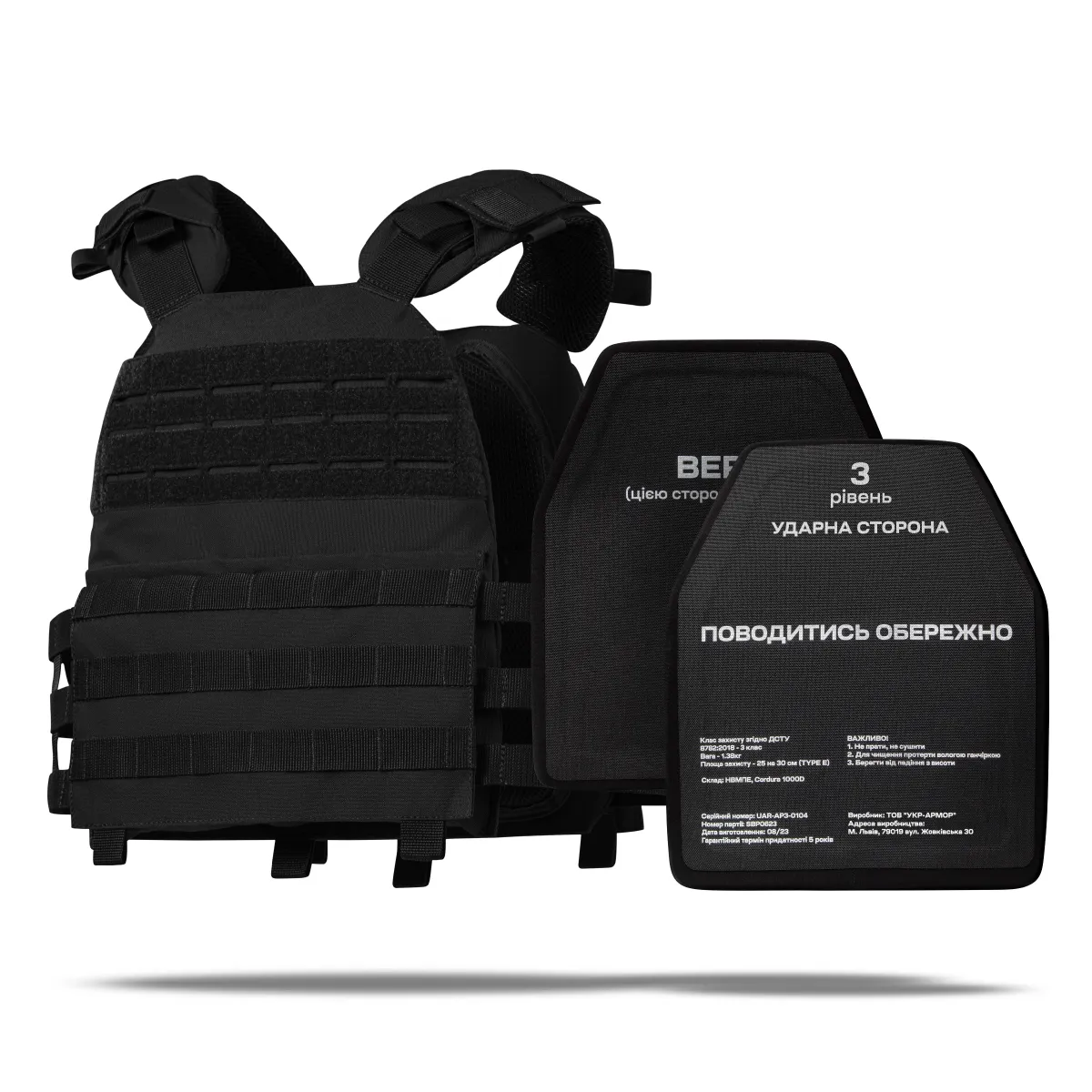 - 2 бронеплити 3-го класу з покращеного НВМПЕ (вага 1.38 кг) розміру 25х30 см;