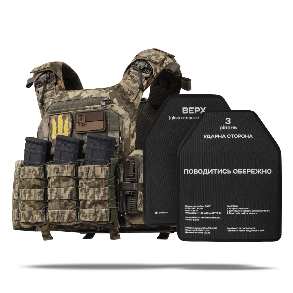 - Комплектація 2 бронеплити 3-го класу (надвисокомолекулярний поліетилен), плитоноска покращена (PRO), копія протоколу відстрілу