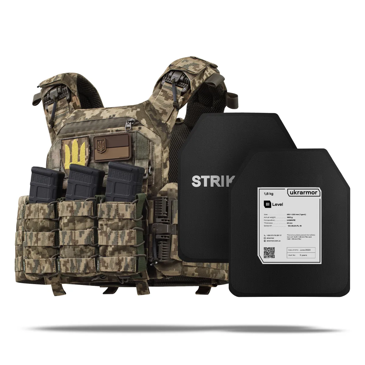 - Комплектація 2 бронеплити 3 класу (вага 1.6 кг, НВМПЕ), плитоноска покращена (PRO).