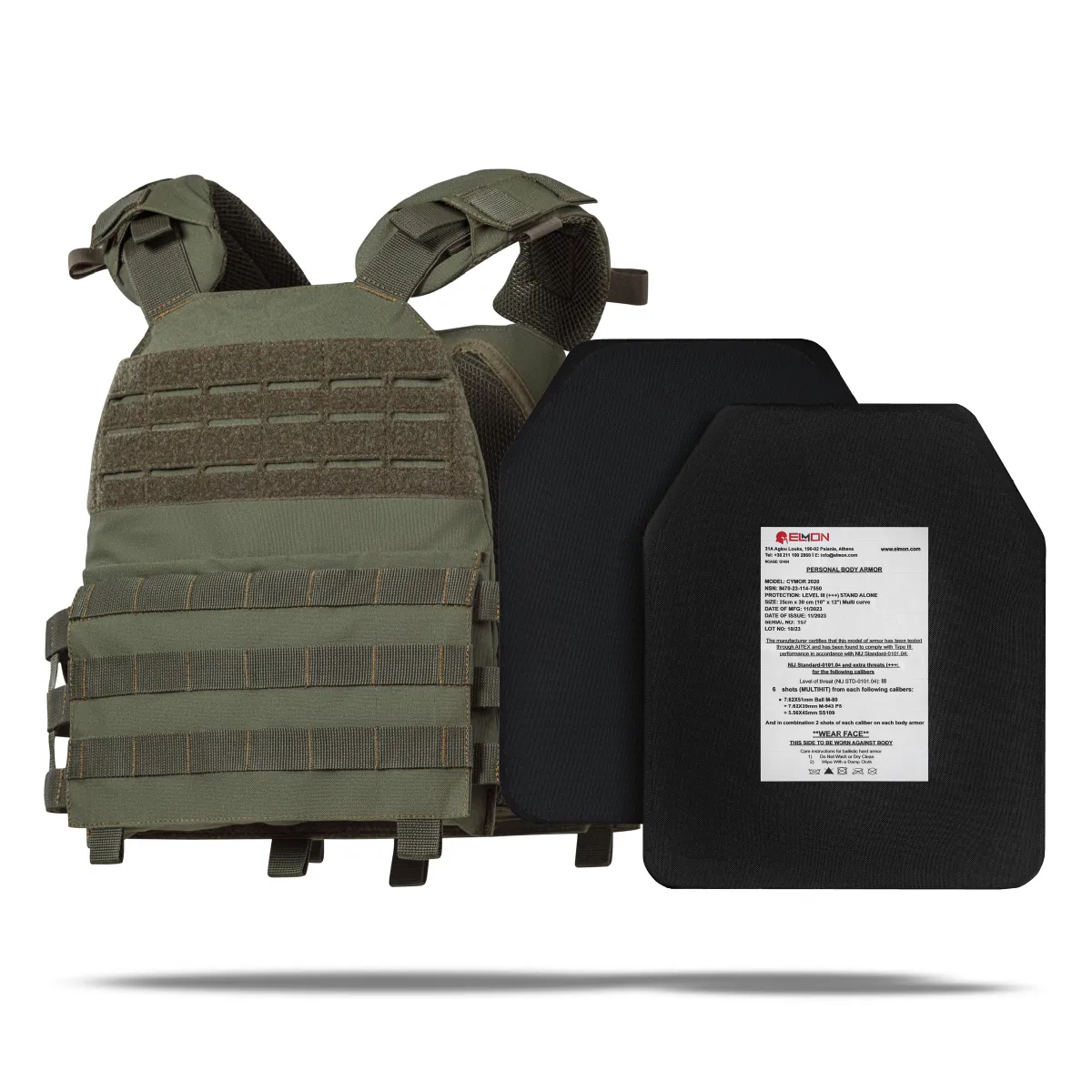 Зручний, легкий та надійний комплект спорядження для справжніх професіоналів, що складається з двох керамічних бронеплит (виготовлені у Греції і сертифіковані європейською лабораторією) та компактної плитоноски M.V.P. з системою швидкого скидання, виготовленої з матеріалу CORDURA 1000. Важко повірити, але при вазі всього 3.8 кг. бронежилет здатний захистити Вас від влучення кулею 7.62 мм, 5.56 мм, а також найбільш розповсюдженого ушкодження – уламків, рикошетів та шрапнелі.