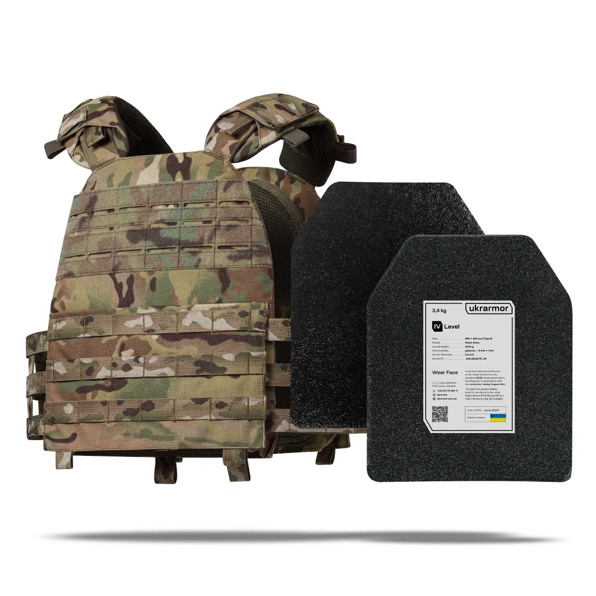 - Комплектація 2 бронеплити (матеріал сталь Armox Advance + полімерний антирикошет), плитоноска M.V.P., копія протоколу відстрілу