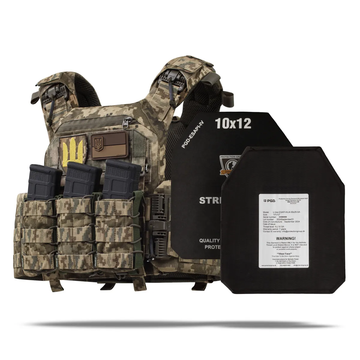 Створений для найскладніших завдань, міцний та надійний бронежилет, що забезпечить вас найвищим у світі класом захисту (Level IV NIJ 0101.06, аналог 6 класу по ДСТУ) при вазі всього 6.4 кг. Комплект складається з двох керамічних бронеплит (виготовлені у Данії та протестовані у лабораторії США) та покращеної плитоноски PPO з системою швидкого скидання з супер м’якими підплічниками та матеріалу CORDURA 1000.