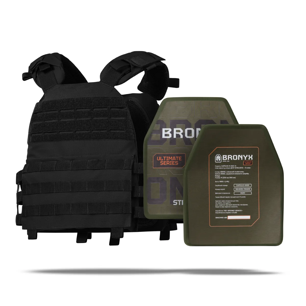 – 2 бронеплити 5 класу Ultimate Bronyx (вага 1.86 кг, матеріал кераміка карбід бору (B4C);