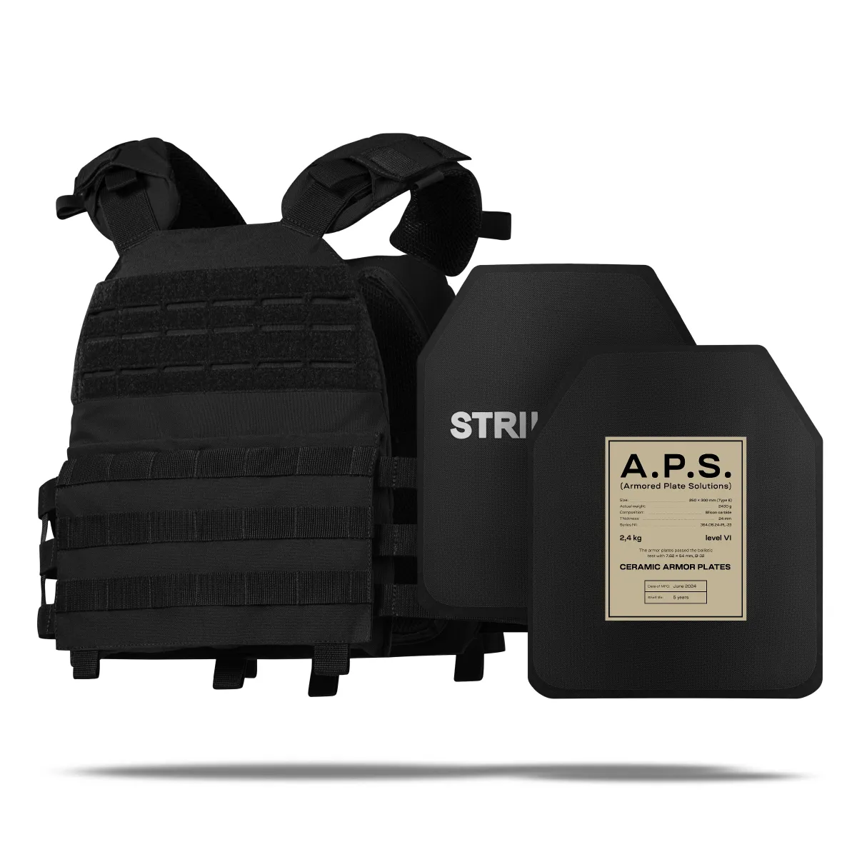 - 2 бронеплити A.P.S. 6-го класу (вага 2.4 кг, матеріал композит кераміки карбіду кремнію SiC) розміру 25х30 см;