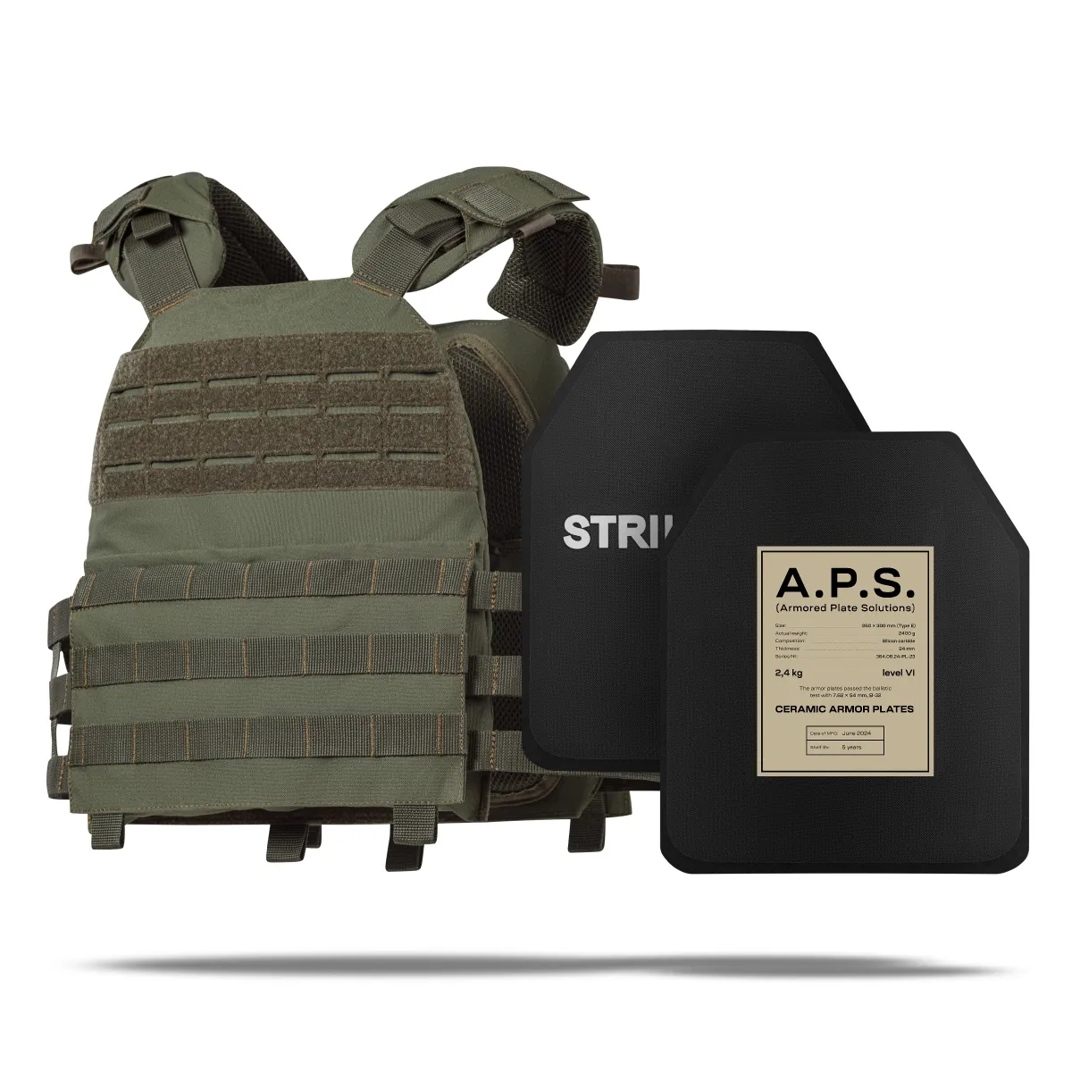 - 2 бронеплити A.P.S. 6-го класу (вага 2.4 кг, матеріал композит кераміки карбіду кремнію SiC) розміру 25х30 см;