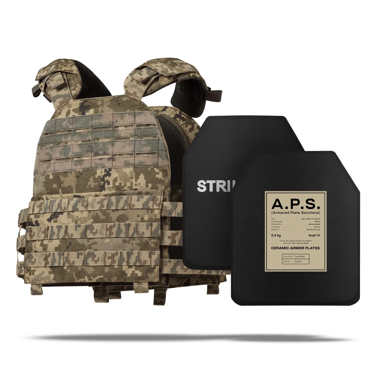 - 2 бронеплити A.P.S. 6-го класу (вага 2.4 кг, матеріал композит кераміки карбіду кремнію SiC) розміру 25х30 см;