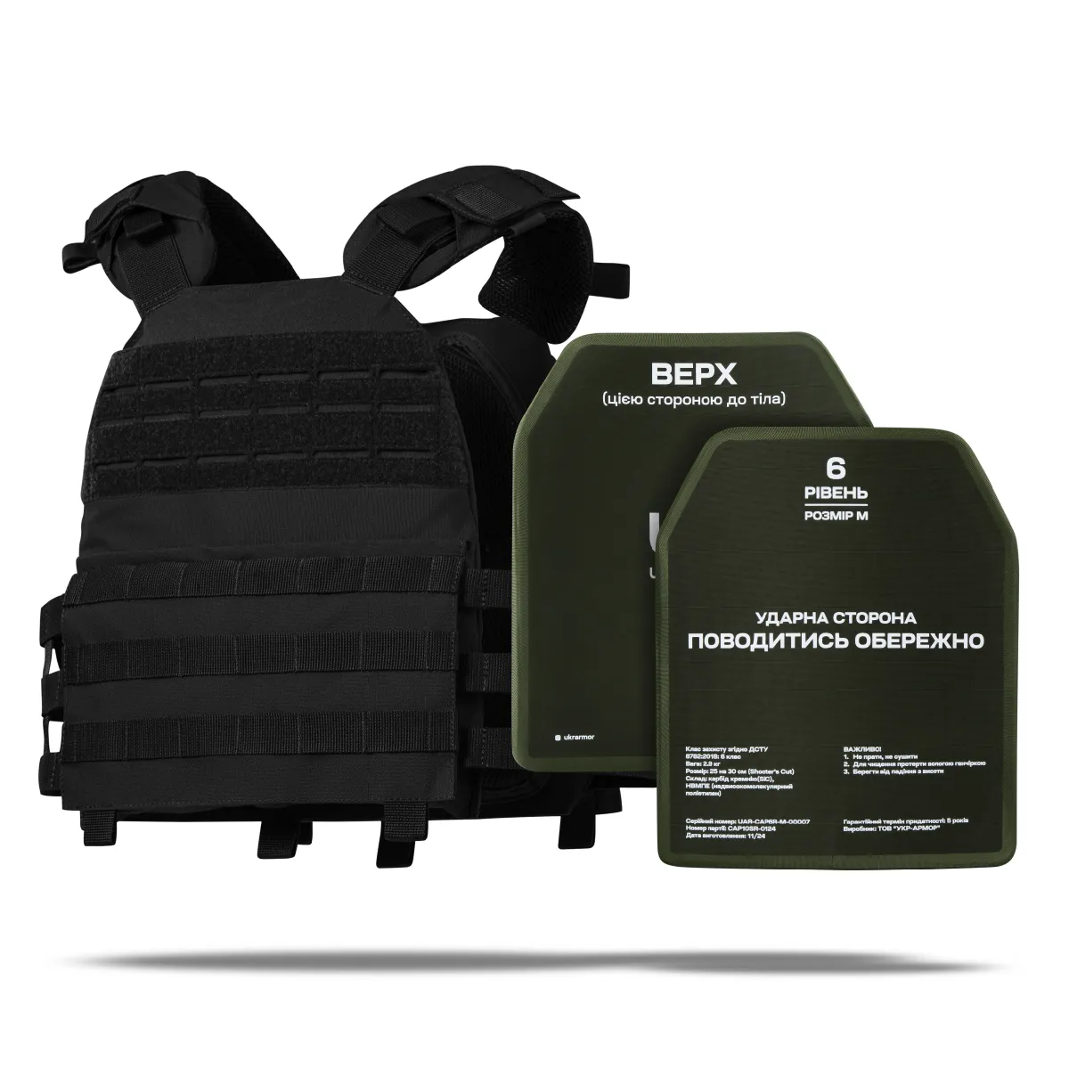 – 2 бронеплити 6-го класу (вага 2.9 кг, матеріал кераміка карбід кремнію SiC);