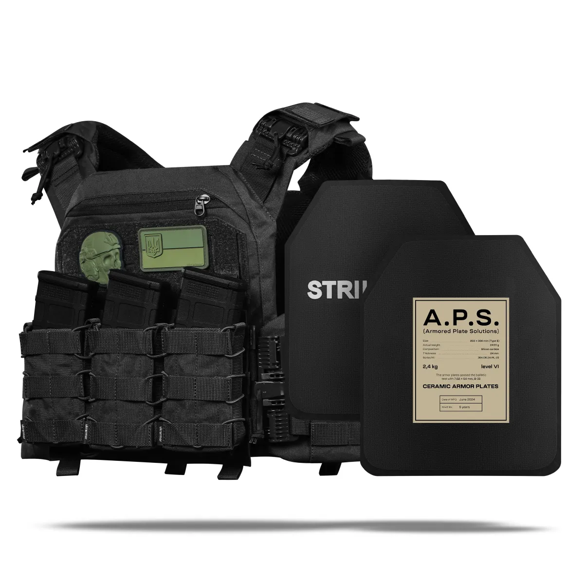 Неймовірно легкий та ергономічно зручний бронежилет з найміцнішими бронеплитами з композиту кераміки карбіду кремнію (SiC), які в змозі витримати три влучання кулі Б-32 із снайперської гвинтівки СВД (це все з відстані 10 м згідно з стандартами ДСТУ 8782:2018.) та плитоноски (PRO) покращеної, виготовленої з матеріалу CORDURA 1000, зі системою швидкого скидання і м'якими підплічниками.