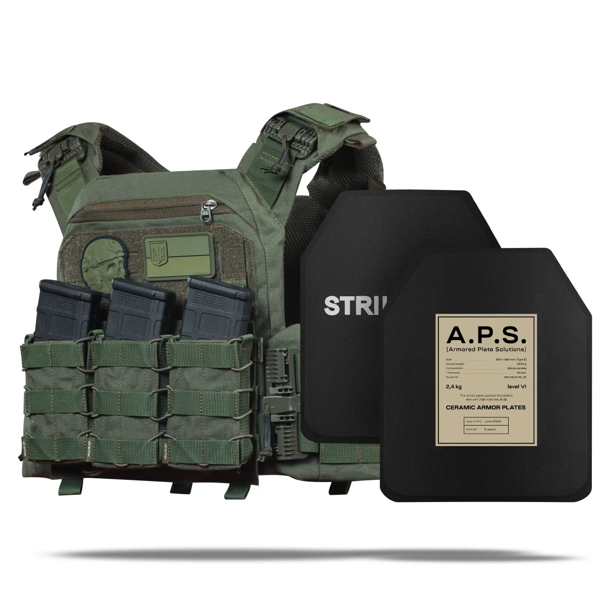 Неймовірно легкий та ергономічно зручний бронежилет з найміцнішими бронеплитами з композиту кераміки карбіду кремнію (SiC), які в змозі витримати три влучання кулі Б-32 із снайперської гвинтівки СВД (це все з відстані 10 м згідно з стандартами ДСТУ 8782:2018.) та плитоноски (PRO) покращеної, виготовленої з матеріалу CORDURA 1000, зі системою швидкого скидання і м'якими підплічниками.