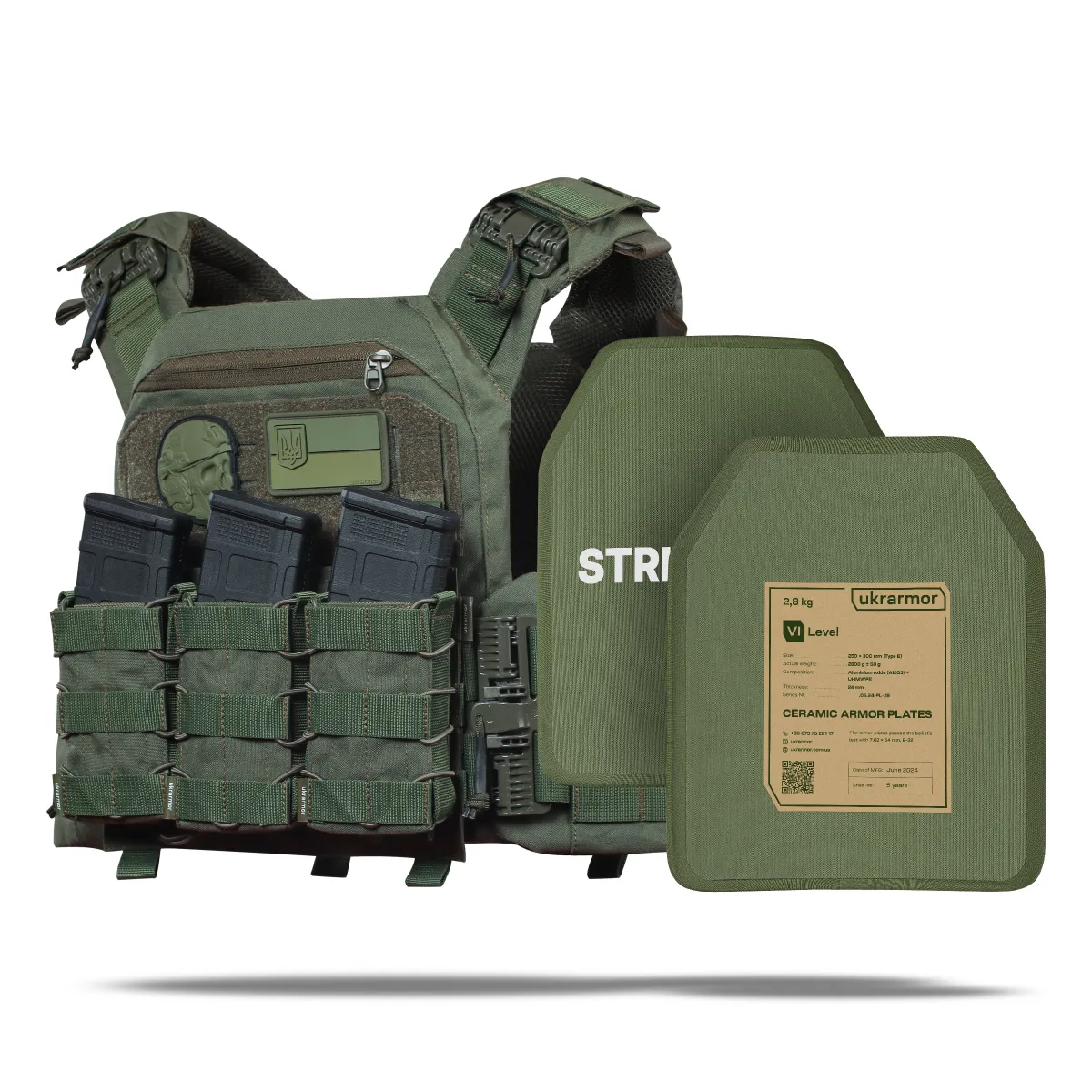 - Комплектація 2 бронеплити 6-го класу (матеріал кераміка алюміній оксид Al₂O₃), плитоноска покращена (PRO), копія протоколу відстрілу