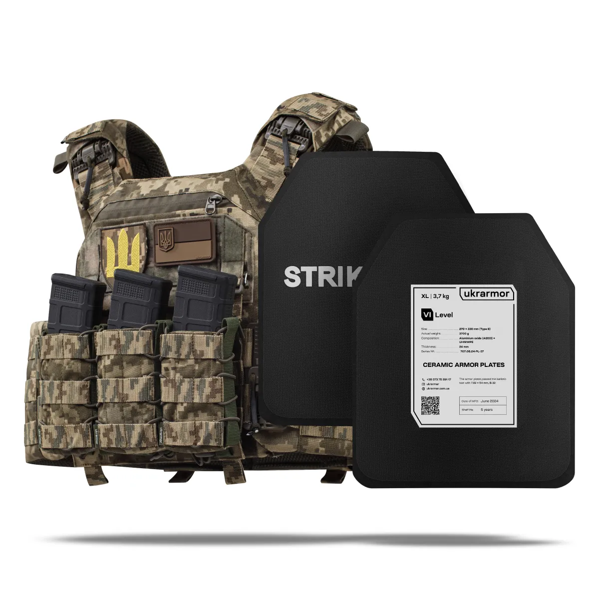 - Комплектація Плитоноска PRO та дві керамічні бронеплити 6-го класу захисту розміру XL (27 х 33 см)