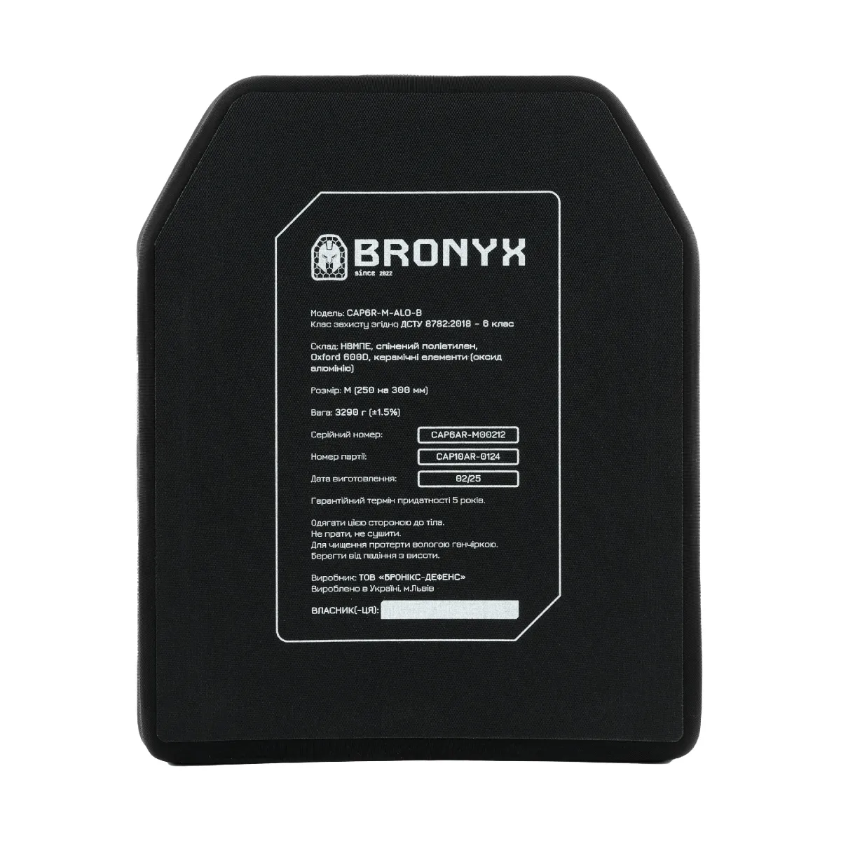 Бронеплита виготовлена компанією Bronyx та проходить обов’язкову сертифікацію згідно ДСТУ 8782:2018, з підтвердженим протоколом відстрілу.