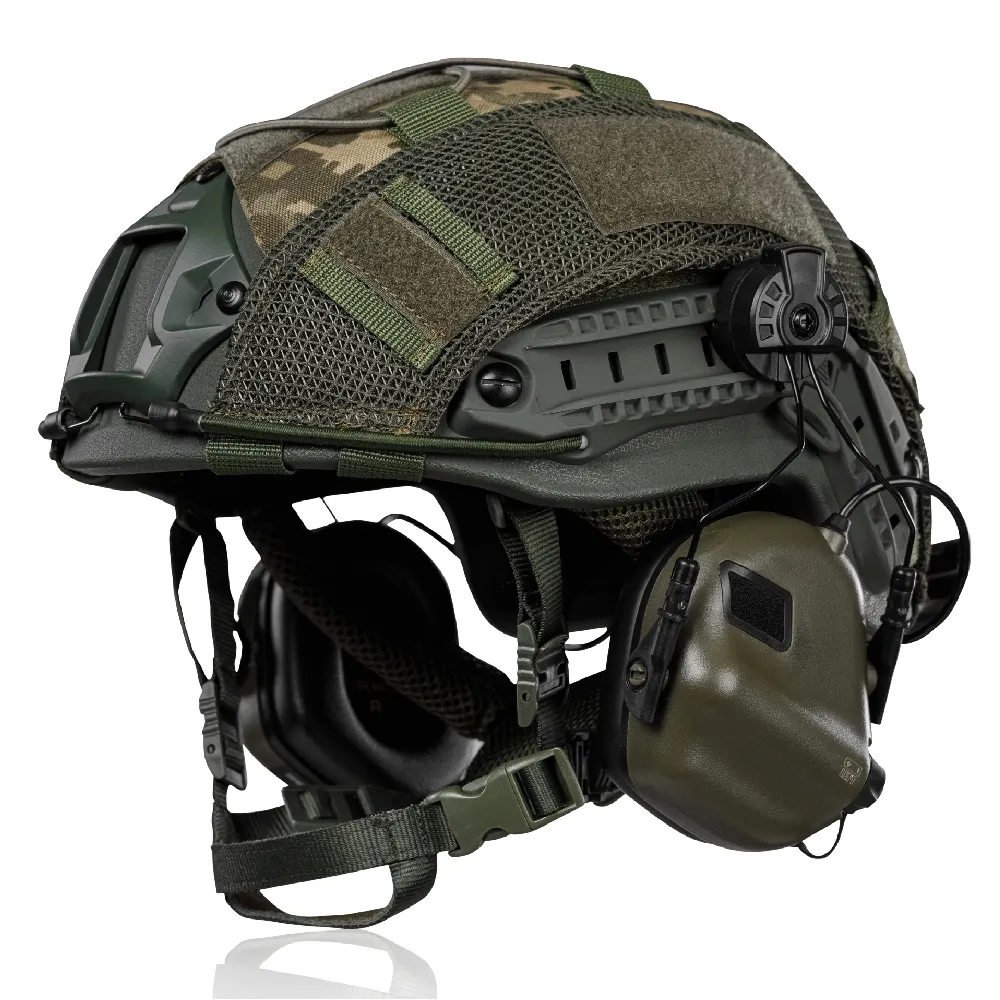Практичний та перевірений комплект для захисту голови, що складається з кевларового шолома Fast з рівнем захисту NIJ IIIA (захищає від уражень уламками, рикошетів та пострілів з легкої стрілецької зброї), активних навушників M31H з шумозаглушенням шкідливих звуків (понад 82 Дб) та маскувального кавера (тактичний чохол на шолом).