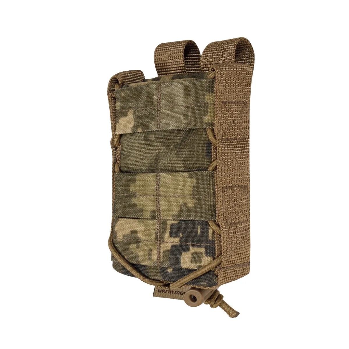 Надійний та міцний військовий аксесуар нашого виробництва для швидкого й зручного доступу до магазину AR 5.56 (20 або 30 набоїв) без зайвих рухів і шуму. Виготовлений із міцної тканини Cordura 1000D Brookwood (США) та обладнаний високоміцними поліамідними стропами, підсумок гарантує довговічність та надійність кріплення до будь-якої екіпіровки з MOLLE-системою. Армовані нитки Tytan і зигзагоподібні закріплення на MOLLE-інтерфейсі забезпечують підвищену міцність швів та фіксування магазину в середині.