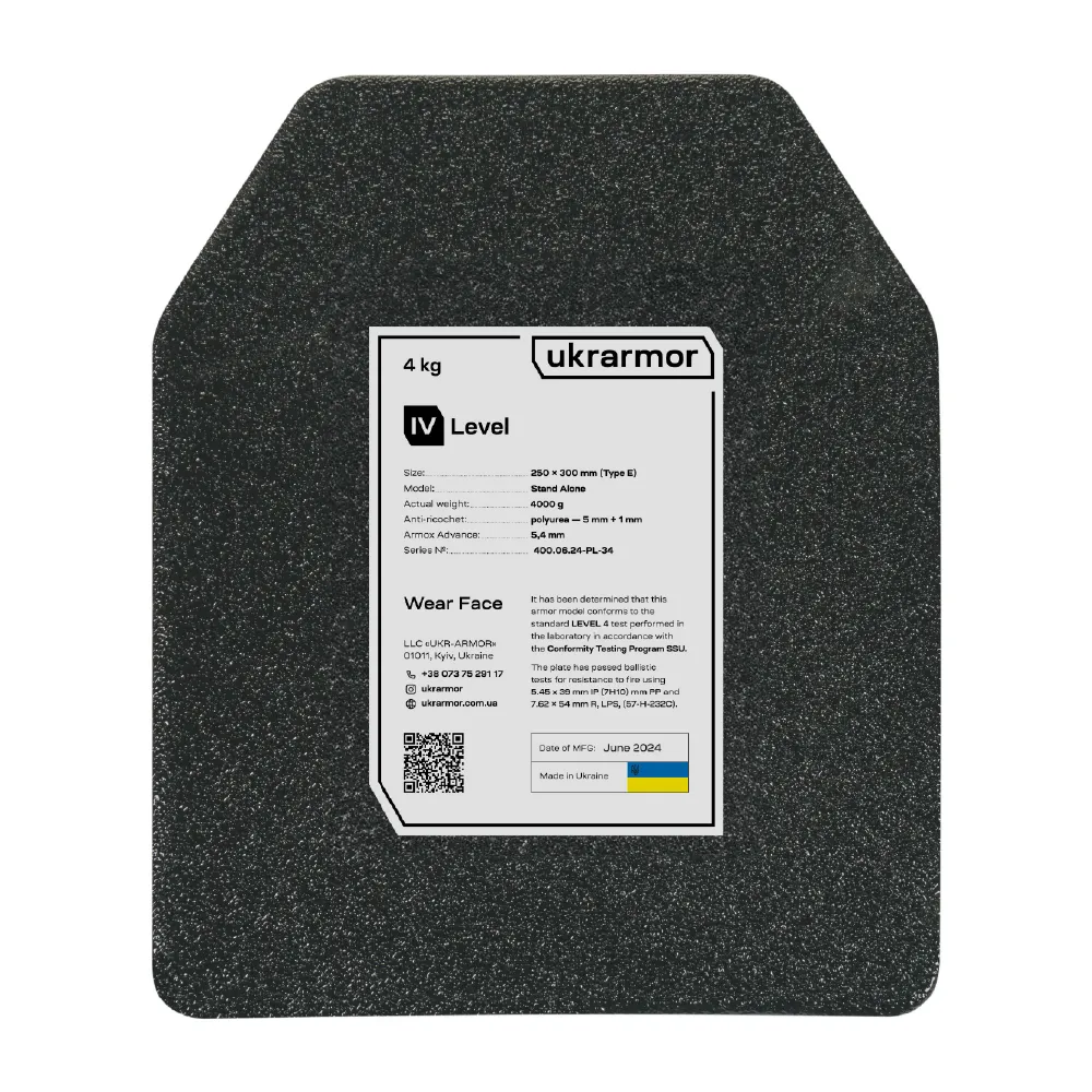 Виготовлена за світовим стандартом та покриті американським полімерним антирикошетом, основа бронеплити 4 класу – найкраща в світі сталь – шведська балістична сталь Armox Advance товщиною 5.5 мм. Саме завдяки додатковому шару сталі, плита має властивості витримувати кулі більшого калібру. Твердість сталевої бронепластини 4 класу досягає 650-700 HB по Брінеллю. Аналогічної твердості при такій вазі не зміг досягти ніхто. Саме завдяки своїй твердості сталь Armox Advance вважається кращою у світі.