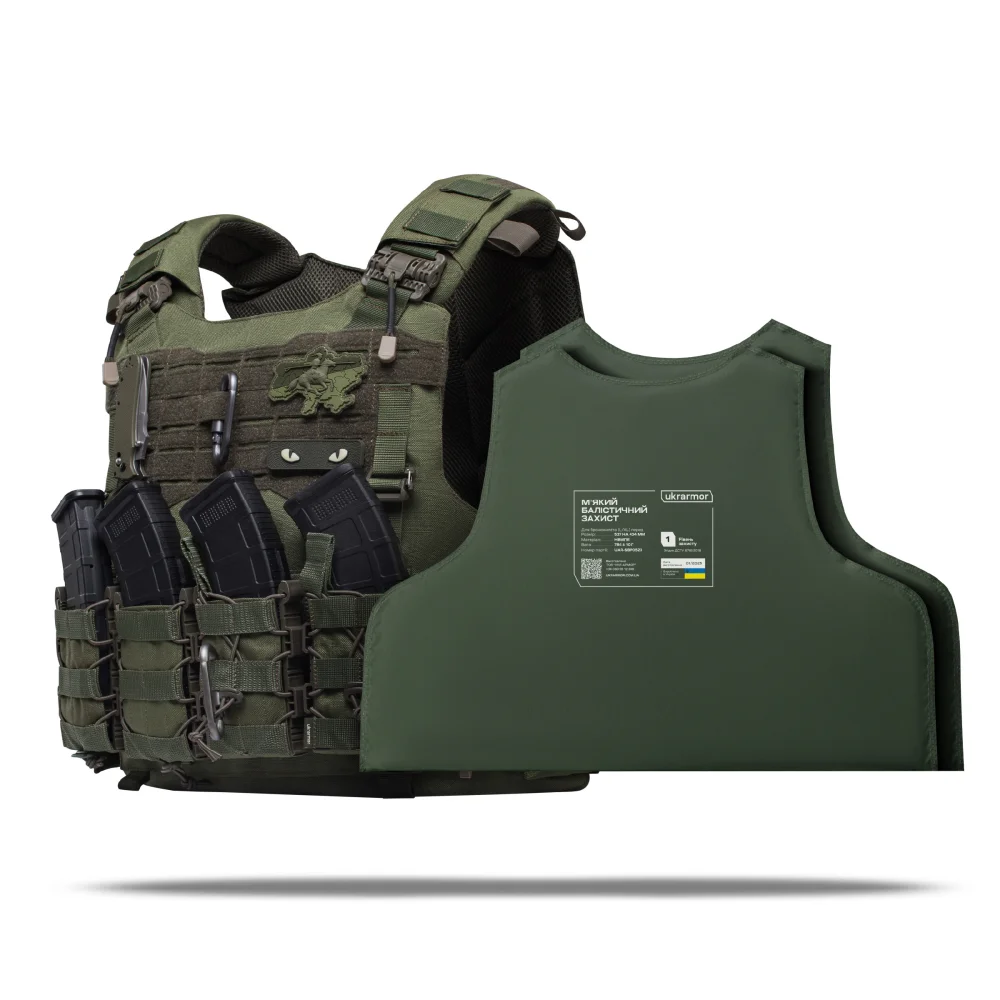 - Комплектация Увеличеная плитоноска и два баллистических пакета 620 на 470 мм, покрывающие всю площадь плитоноски.