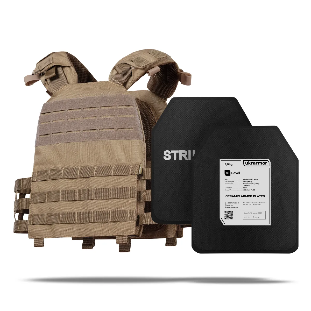 - Комплектация 2 бронеплиты 6-го класса (вес 2.8 кг, материал керамика Алюминий Оксид Al₂O₃), плитоноска M.V.P