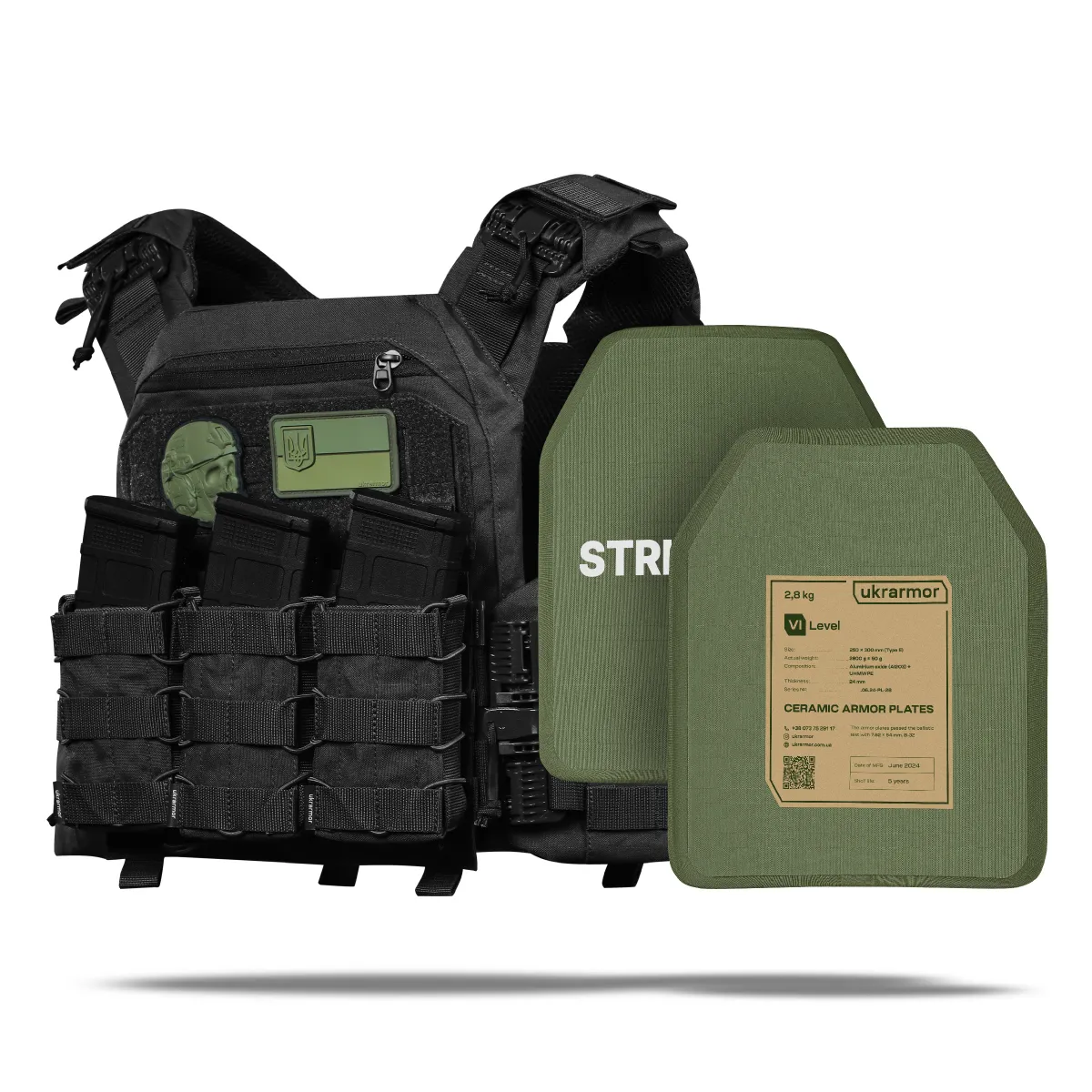- Комплектация 2 бронеплиты 6-го класса (материал керамика алюминий оксид Al₂O₃), плитоноска улучшенная (PRO), копия протокола отстрела
