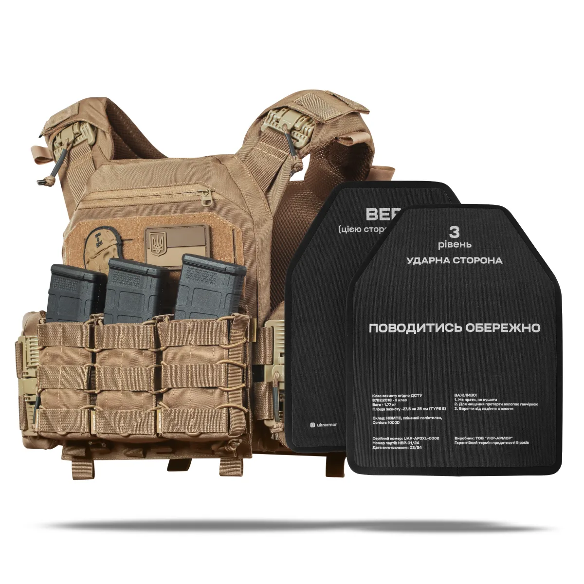 Бронеплиты выдерживают по 3 попадания пуль 5.45 х 39 мм. ПС со стальным нетермоупрочненным сердечником и 7.62 х 39 мм. ПС. со стальным нетермоупрочненным сердечником с 10 метров согласно ДСТУ 8782:2018.