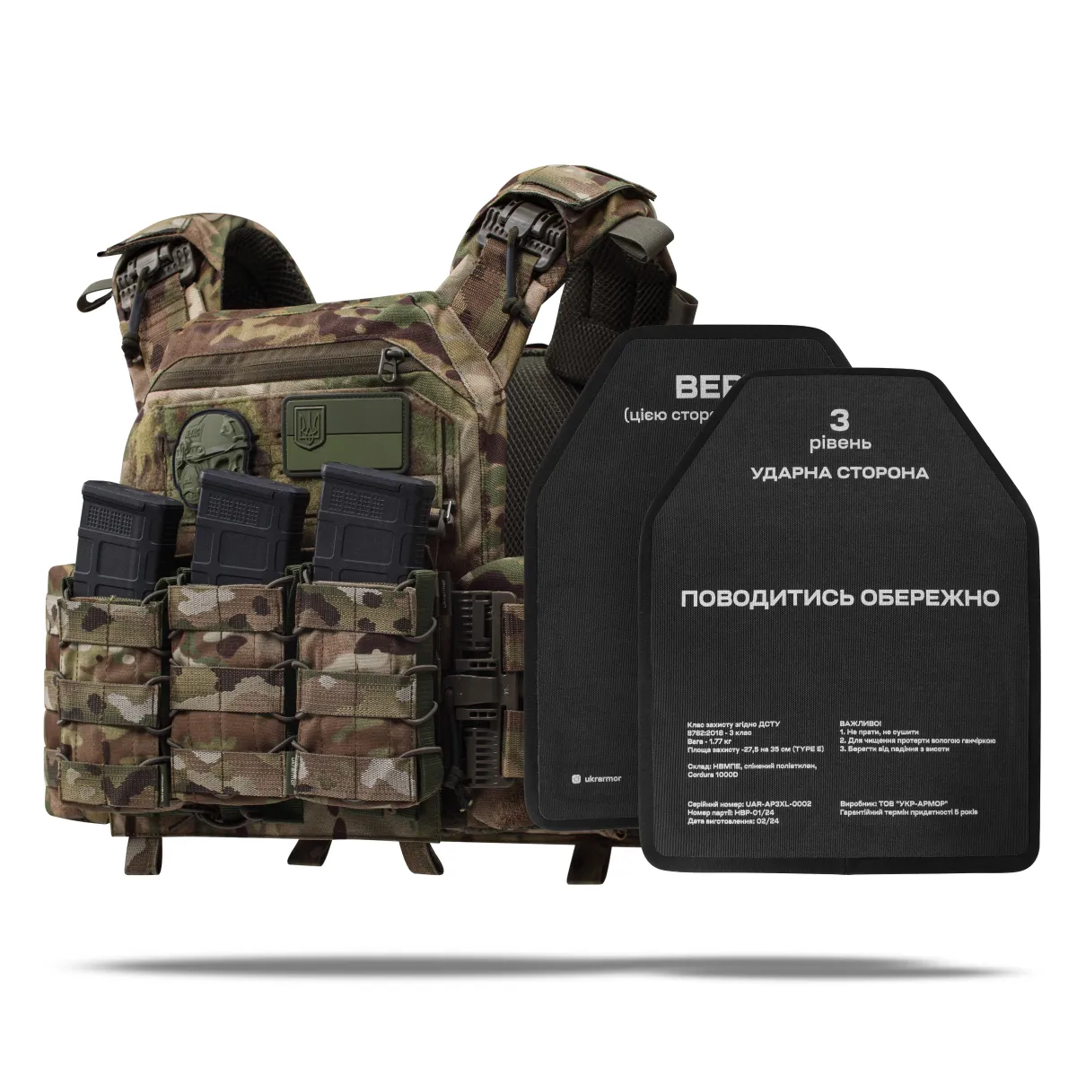 Бронеплиты выдерживают по 3 попадания пуль 5.45 х 39 мм. ПС со стальным нетермоупрочненным сердечником и 7.62 х 39 мм. ПС. со стальным нетермоупрочненным сердечником с 10 метров согласно ДСТУ 8782:2018.