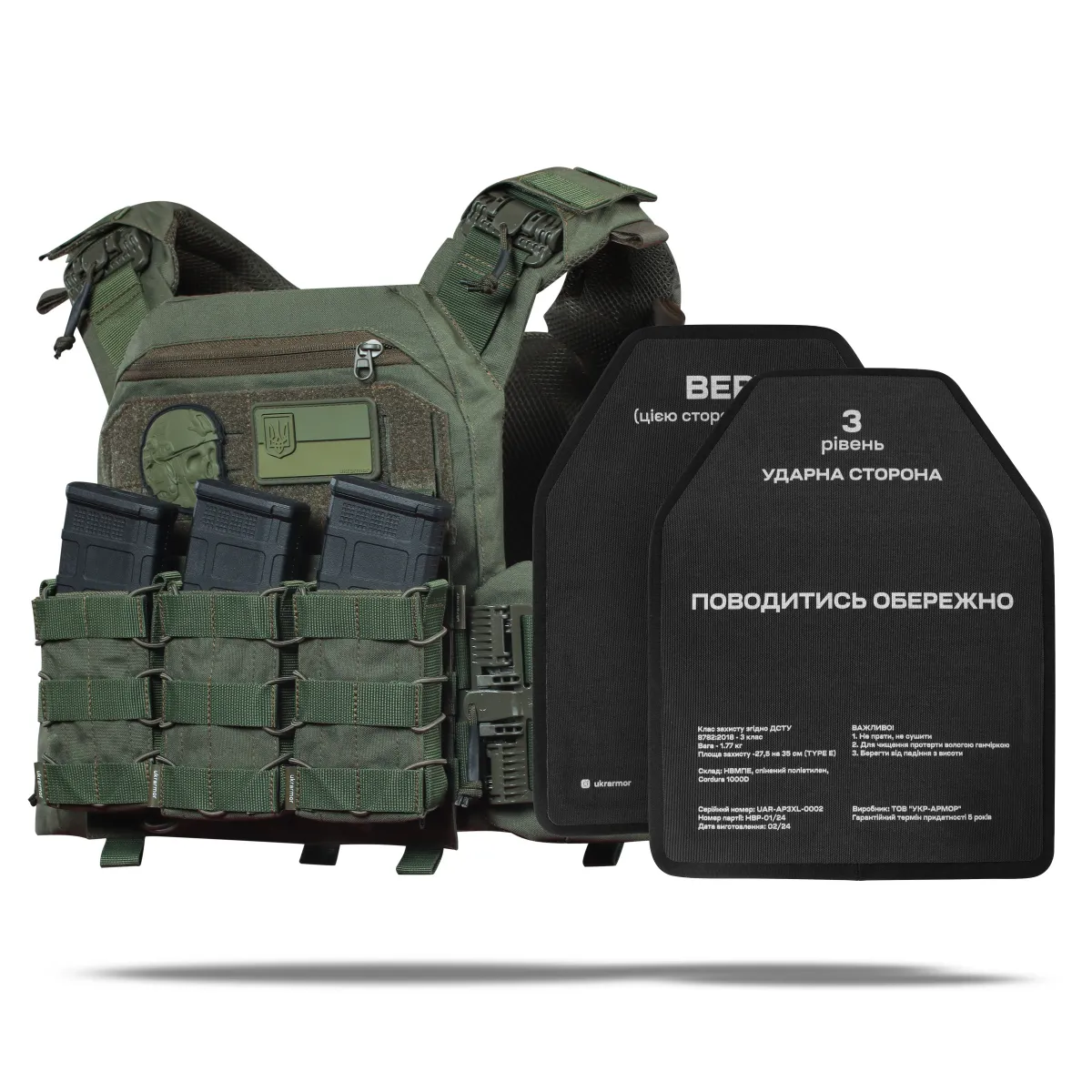 Бронеплиты выдерживают по 3 попадания пуль 5.45 х 39 мм. ПС со стальным нетермоупрочненным сердечником и 7.62 х 39 мм. ПС. со стальным нетермоупрочненным сердечником с 10 метров согласно ДСТУ 8782:2018.