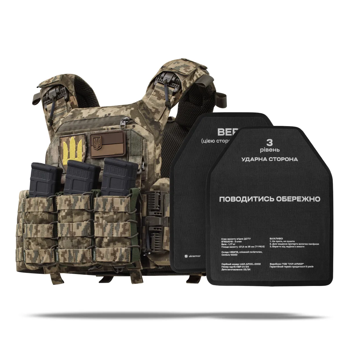 Бронеплиты выдерживают по 3 попадания пуль 5.45 х 39 мм. ПС со стальным нетермоупрочненным сердечником и 7.62 х 39 мм. ПС. со стальным нетермоупрочненным сердечником с 10 метров согласно ДСТУ 8782:2018.