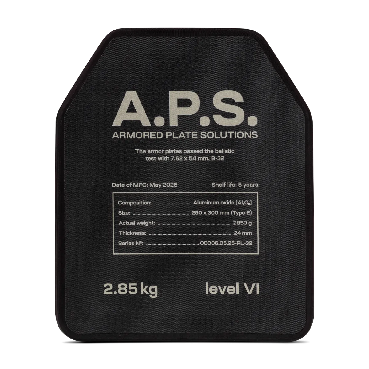 Бронеплита 6 класса A.P.S. изготовлена из керамо-композитного материала на основе оксида алюминия (Al₂O₃). Она способна выдержать три попадания бронебойно-воспалительного шара Б-32 калибра 7,62×54R с остроконечной головной частью, термоукрепленным стальным сердечником и стальной оболочкой согласно ДСТУ 8782:2018 (выстрел из снайперской винтовки СВД).