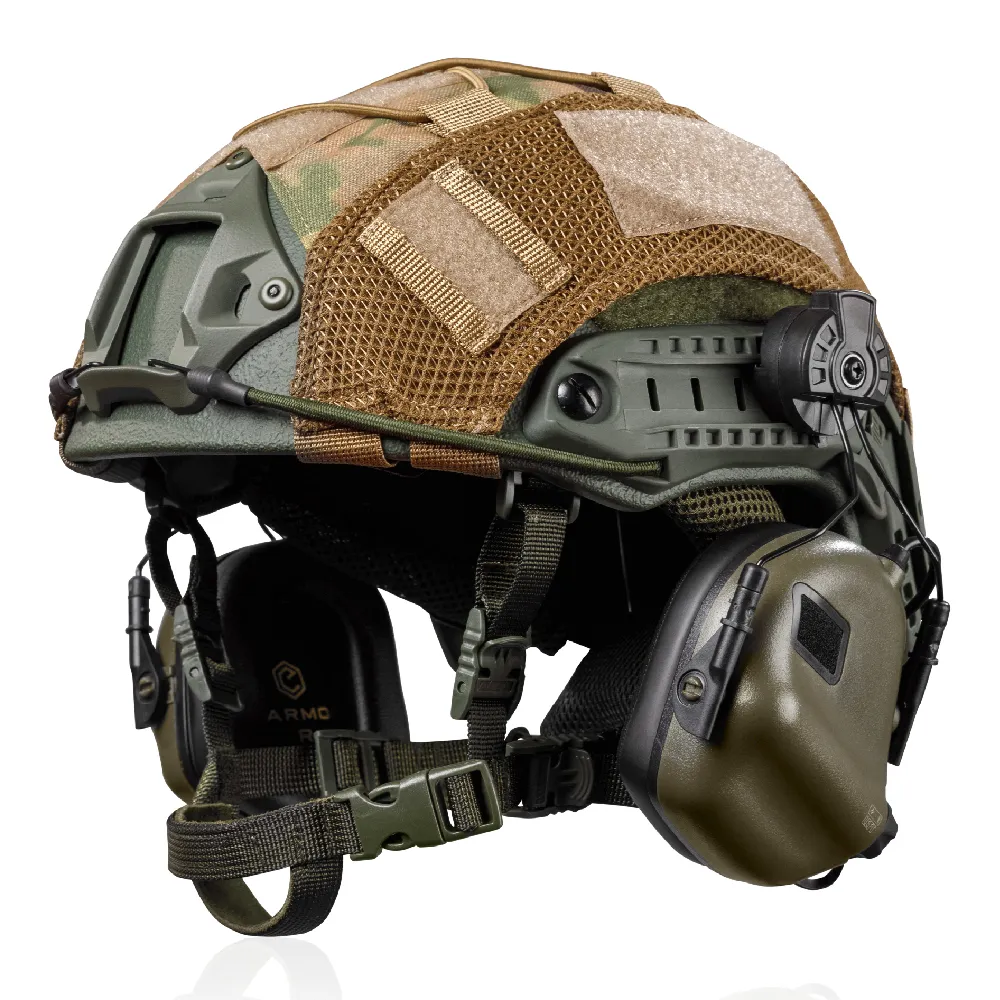 Практический и проверенный комплект для защиты головы, состоящий из шлема ФАСТ с наушниками с уровнем защиты NIJ IIIA (защищает от поражений осколками, рикошетов и выстрелов из легкого стрелкового оружия), активных наушников M31H с шумоподавлением вредных звуков (более 82 Дб) и маскировочного кавера (тактический чехол на шлем).