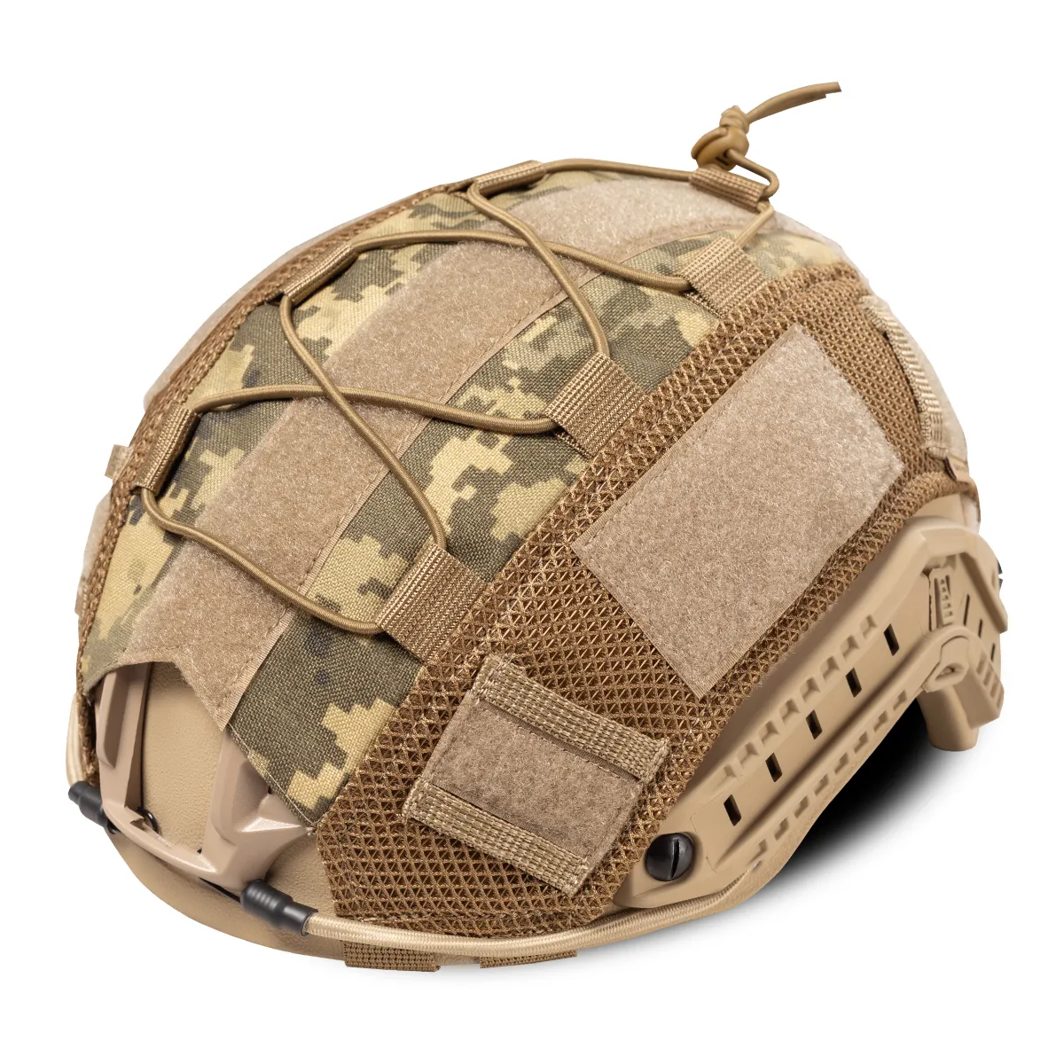 Кавер можно легко прикрепить к шлему с помощью велкро-панелей (липучек), которые расположены по бокам, сзади и сверху. Эти панели предназначены для крепления идентификаторов, маячков и различных шевронов. На чехле также есть специальные стяжки, позволяющие удобно закрепить шнуры или дополнительный камуфляж.